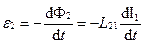 Коэффициенты пропорциональности Коэффициенты Теорема взаимности. Соответствующий расчет дает (и опыт его подтверждает), что при отсутствии ферромагнетиков коэффициенты L |2 и L 21 одинаковы: L12 = L21. (3.25) Это замечательное свойство взаимной индуктивности принято называть теоремой взаимности. Благодаря этой теореме можно не делать различия между Смысл равенства (3.25) в том, что в любом случае магнитный поток Однако наличие ферромагнетиков меняет дело, и теорема взаимности перестает выполняться. Взаимная индукция – это явление возникновения ЭДС индукции в одном контуре при изменении тока в другом контуре. Наличие магнитной связи между контурами проявляется в том, что при всяком изменении тока в одном из контуров в другом контуре возникает ЭДС индукции. Это явление и называют в з а и м н о и индукцией. Согласно закону электромагнитной индукции ЭДС, возникающие в контурах 1 и 2, равны соответственно: