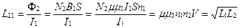 Здесь предполагается, что контуры неподвижны и ферромагнетиков поблизости нет. На явлении взаимной индукции основан принцип действия трансформаторов, применяемых для повышения или понижения напряжения переменного тока. Пример. В заключение этого параграфа оценим взаимную индуктивность двух коаксиальных неферромагнитных соленоидов [6] – соленоидов с общей осью. Пусть площади их поперечного сечения совпадают (S1 =S2=S), совпадают также их длины (l1=l2= l), а разными будут числа витков на единицу длины n1 и n2. Для расчета
