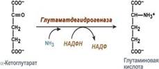 L-глутамат + H2O + NAD+ ↔ α-кетоглутарат+ NH3 + NADH + H+ (EC 1.4.1.2): L-глутамат + H2O + NAD(P)+ ↔ α-кетоглутарат + NH3 + NAD(P)H + H+ (EC 1.4.1.3): (EC 1.4.1.4):