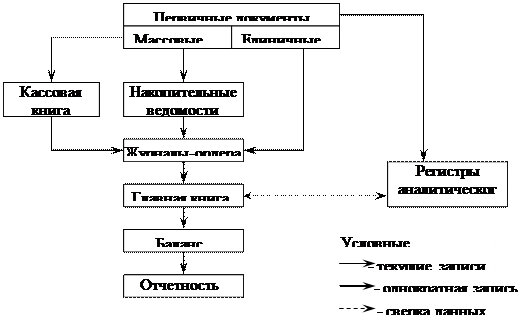В основу журнально-ордерной формы учета положен принцип накапливания и систематизации данных первичных учетных документов в специальных регистрах в разрезах, обеспечивающих синтетический и аналитический учет хозяйственных операций по всем разделам бухгалтерского учета. В журнально-ордерной форме учета применяются два вида учетных регистров - журналы-ордера и вспомогательные ведомости. Данные первичных документов, как правило, группируются предварительно во вспомогательных ведомостях, из которых итоги переносятся в журналы-ордера. В отдельных случаях в целях группировки учетных данных могут применяться и специальные разработочные таблицы. ["Учетная политика - 2010" (Семенихин В.В.) ("Налоговый вестник", 2010)]