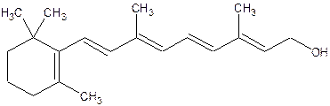 Хромофорной группой, обуславливающей окраску каротиноидов, является длинная система сопряженных двойных связей. Поэтому при значительном нарушении этой системы Каротиноиды обесцвечиваются. Это происходит, например, при гидрировании их с активным катализатором. Каротиноиды являются сильно ненасыщенными веществами, поэтому как в кристаллах, так и растворенные в масле, они легко окисляются кислородом воздуха. При окислении каротиноиды постепенно обесцвечиваются. Каротиноиды легко окисляются такими сильными окислителями, как хромовая кислота. Длительное воздействие на растворы каротина в жирах УФ – и γ – излучения приводит к их обесцвечиванию. При нагревании до 50 - 70°С каротиноиды практически не изменяются. В жире при высоко температуре они могут полиризоваться. Молекулы α – и β – каротина имеют по 11 сопряженных двойных связей; γ – каротин имеет 12 сопряженных связей. Каротины растворимы в хлороформе, бензоле, диэтиловом эфире, нерастворимы в этаноле и воде. Все без исключения другие природные каротиноиды являются производными четырех указанных выше углеводородов – ликопина и каротинов. Они образуются их эти углеводородов путем введения гидроксильных, карбонильных или метоксильных групп, или же путем частичной гидрогенизации или окисления. Витамин А, получаемый из β – каротина имеет формулу: