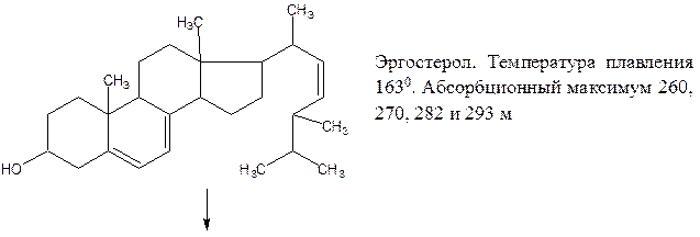 Провитаминными свойствами обладает ряд стеролов. Для этого необходимо наличие двух конъюгированных связей во втором кольце. Структура боковой цепи оказывает количественное влияние на активность. Удлинение боковой цепи на 1 атом углерода сверх 9 снижает или почти лишает стерол и стеролпризводных их провитаминных свойств. Структурная формула эргостерола установлена в следующем виде: