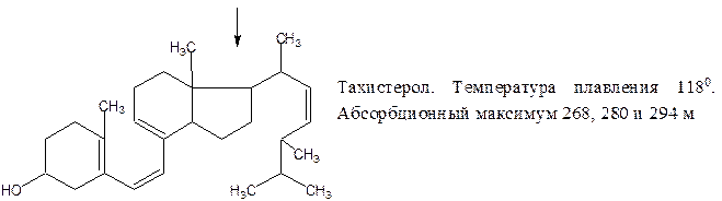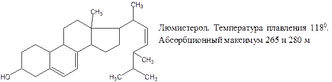 Молекула эргостерола состоит из четырех колец. В первом кольце имеется спиртовая группа, во втором кольце – две конъюгированные связи; к четвертому кольцу присоединена боковая цепь из 9 углеродных атомов. Являясь ненасыщенным соединением (3 двойные связи), эргостерол легко окисляется и темнеет в присутствии света и кислорода воздуха даже при обычной температуре. При облучении растворов эргостерола происходит сложная фотохимическая реакция с образованием ряда фотодериватов. Ниже приведены структурные формулы и краткая физико-химическая характеристика фотодериватов, получаемых при облучении эргостерола. Люмистерол представляет собой изомер эргостерола, имеет в своей молекуле четыре кольца, три двойных связи и почти тот же спектр поглощения. Различие между эргостеролом и люмистеролом является пространственное перемещение одной метильной группы из цис-положения в трас-положение. Тахистерол не обладает антирахитическими свойствами. При образовании тахистерола происходит разрыв второго кольца между 9 и 10 атомами углерода. От люмистерола тахистерол отличается тем, что имеет три кольца, а не четыре. Кроме того, в молекуле тахистерола возникает четвертая двойная связь. Он весьма чувствителен к окислителям в присутствии кислорода образует пероксид, который в свою очередь, может окислить витамин D2. Тахистерол не обладает витаминной активностью, но он способен повышать содержание кальция в крови. Супрастеролы являются конечными продуктами фотохимической реакции. Они содержат четыре кольца, боковую цепь и гидроксильную группу, подобно эргостеролу, но не обладают антирахитической способностью. Таким образом, под влиянием ультрафиолетового облучения (длина волны 280 – 313 нм) эргостерол и различные его производные превращаются в витамины группы D. Способность различных производных стеролов превращается в витамин D под влиянием ультрафиолетового облучения связана с наличием во втором ядре стеролов сопряженных двойных (конъюгированных) связей. Насыщение одной из этих связей лишает стерол его провитаминных свойств. Насыщение двойной связи в боковой цепи не лишает молекулу стерола способности превращаться в витамин D.