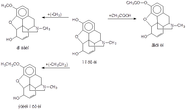 Алкалоиды мама снотворного – опийные алкалоиды. Опий – это сгущенный млечный сок мака. Раньше алкалоиды выделяли из опия, а в настоящее время – из маковой соломки. Главный алкалоид опия – морфин (в 1833 г.). Это сильное болеутоляющее средство. Оказывает тормозящее действие на нервную систему => наркомания. Морфин очень токсичен и разрушающе действует на человеческий организм. Вследствие высокой токсичности и привыкания, его применение ограничено. Используется только при очень сильных болях. В млечном соке мака наряду с морфином содержатся и другие опиаты, которые представляют собой его модификации – кодеин и этилморфин.<Их получают из морфина синтетическим путем, замещая группу –OH => на метильный и этильный радикалы. При замещении гидроксила в молекуле морфина уксусной кислотой получают героин.>