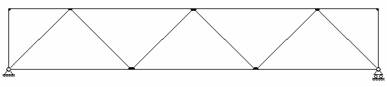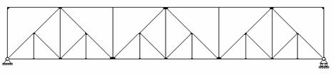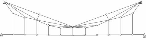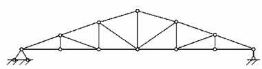 Рис.4.1 Иногда используются пространственные фермы, расчет которых обычно сводится к расчету нескольких плоских ферм. Расстояние между осями опор фермы называется ее пролетом. Стержни, расположенные по внешнему контуру, называются поясными и образуют пояса. Вертикальные стержни, соединяющие пояса, называются стойками, наклонные – раскосами. Стойки и раскосы образуют решетку фермы. Расстояние между соседними узлами пояса фермы называется панелью. Классификацию ферм обычно проводят по пяти признакам: 1) характеру очертания внешнего контура; 2) типу решетки; 3) типу опирания фермы; 4) назначению; 5) уровню езды. По характеру очертания различают фермы с параллельными поясами (рис.4.2, а), треугольные фермы (рис.4.2, б) и с ломанным, или полигональным расположением поясов (рис.4.2, в). а) б) в) Рис.4.2 В зависимости от типа решетки различают фермы различных типов. Наиболее распространенными являются раскосные фермы (рис.4.3), фермы с треугольной решеткой (рис.4.4), фермы с полураскосной решеткой (рис.4.5) и фермы с ромбической решеткой (рис.4.6). Раскосы, идущие вверх от опор к середине фермы, называют восходящими раскосами (рис.4.1), идущие наоборот - нисходящими раскосами (рис.4.3). Фермы, усиленные дополнительными стержнями (шпренгелями), называют шпренгельными фермами (рис.4.7).