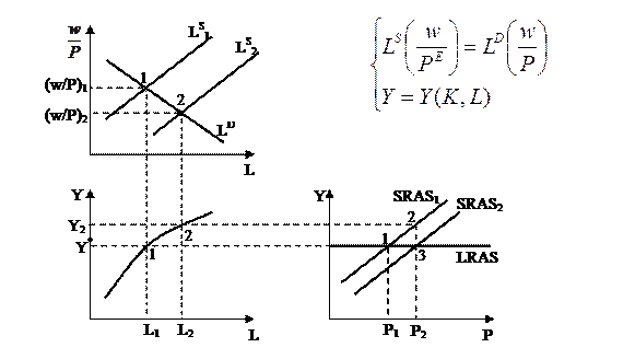 У короткому періоді поточний випуск на деякий час може відхилятися від потенційного, якщо фактичний рівень цін відхиляється від раціонально очікуваних цін. Пояснення до системи графіків: перехід від т.1 до т.2 на графіку 1 ілюструє те, що в своїх очікуваннях помиляються підприємці, у них виникає ілюзія відносного ↑-ня цін (зростання моїх цін по відношенню до загального рівня). Під впливом цієї цінової ілюзії підприємці ↑-ть попит на працю, відповідно ↑-є з.п.. Наймані працівники сприймають ↑-ня з.п. як додатковий стимул до праці. Відповідно ↑-є зайнятість. На графіку виробничої ф-ії додаткова зайнятість означає ↑-ня випуску (