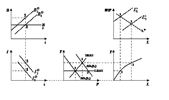У поясненні заг. рівноваги є 2 рівні: локальний (пояснення окремих рівнів: попит на цінні папери – заощадження, пропозиція цінних паперів - інвестиції) та загальний. Заг. рівновага: 1) локальний рівень - відбуваються несподівані зміни грошової пропозиції. Зростання пропозиції грошей спричиняє зростання реальних касових залишків (М/Р), Заг. особливість пояснення рівноваги: рівновага на загальнонаціональному рівні пояснюється з позицій рівноваги на локальних ринках; рівновага пояснюється з позицій відносних цін і помилки суб’єктів стосовно цих відносних цін. Пояснення до с-ми графіків: перехід від т.1 до т.2 на всіх графіках ілюструє зміни у короткому періоді. Вони відбуваються на рівні ек-ки як цілого і є результатом тих процесів, які почалися раніше на локальних ринках і були спричинені неочікуваним грошовим імпульсом. ↑-ня випуску У за графіком виробничої функції – наслідок хибного сприйняття виробниками ↑-ня заг. рівня цін як зростання цін лише локального рівня (тобто як збільшення відносних цін).