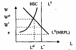 Пояснення до графіку: 1. Якби не було ухилень, то зайнятість була б на рівні L*, а з/п W*. 2. Оскільки з/п завищується до рівня Wef і функція NSC лівіше, ніж звичайна пропозиція, то завжди існуватиме вимушене безробіття в обсязі L* - Lef.