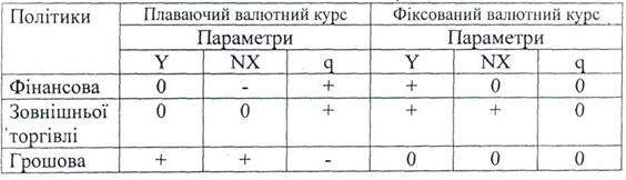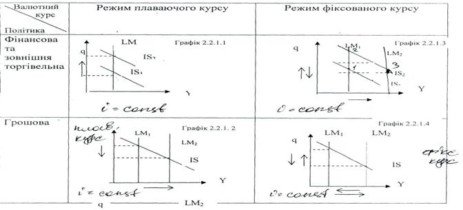 Висновки у підсумковій таблиці: 0 –нейтрально; + позитивний результат; - негативний. З точки зору Y грошова політика є ефективною при плаваючому курсі, а фінансова і зовн-торг – при фіксованому. (Мандел+Флемінг). За будь-якого режиму валют курсу одна з політик –неефективна, щоб зробити 2 політики ефективними треба мати режим єдиної валютної зони.