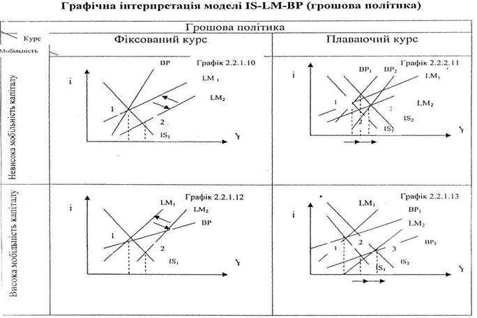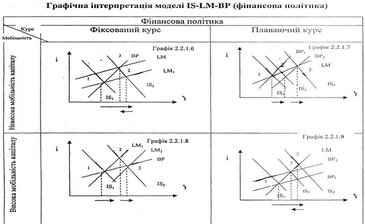 Нахил ВР відображає залежність платіжного балансу через КАВ від різниці між вітчизняною і світовою ставками %. Точки, що знаходяться на ВР – комбінації У та і, які передбачають, що платіжний баланс зводиться до нульового сальдо. Всі точки праворуч – від’ємне сальдо платіжного балансу. (Y↑ →m↑→”-”); ліворуч – додатне сальдо. Лінії ВР можуть зрушуватись: правостороннє зрушення-девальвація (знецінення валюти), лівостороннє – ревальвація. Чинники руху праворуч: 1. зростання світової ставки %. 2. зменшення цін на закордонні товари в порівнянні з вітчизняними цінами. 3. під впливом відносного скорочення доходів іноземців. Матрицю умов моделі IS-LM-BP у порівнянні з моделлю Мандела-Флемінга вводиться: додаткова умова – мобільність капіталу.