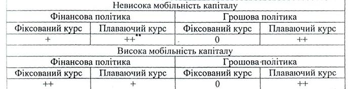 Дуже ефективною є: 1. фінансова політика, невисока мобільність, плаваючий курс; 2. фінансова політика, висока мобільність, фіксований курс; 3. грошова політика, невисока мобільність, плаваючий курс; 4. грошова політика, висока мобільність, плаваючий курс. За плаваючого курсу обидві політики є ефективними тоді як при фіксованому курсі ефективною є лише фінансова політика. Мобільність капіталу справляє вплив лише на фінансову політику тоді як грошова політика не реагує на зміни мобільності капіталу. Для фінансової політики результати якої пов’язані з мобільністю капіталу спостерігається підвищення ефективності за фіксованого курсу і навпаки, зменшення ефективності при плаваючому курсі. Загалом для країни краще плаваючий курс, бо робить ефективною грошову політику.