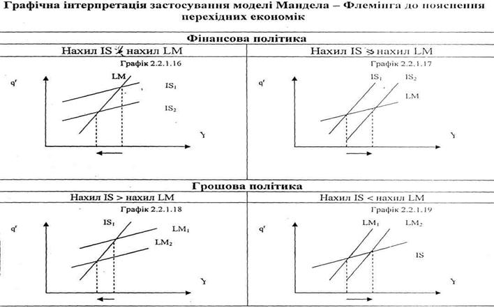 Функція IS з врахуванням зроблених припущень стає висхідною.Відмінності реакції фінансової і грош сфер на зміни реал курсу національної валюти (відмінність нахилу IS і LM). Висновки:1. якщо стимулююча фін політика, то позитивні результати по У маємо тоді, коли фін сфера більше реагує на зміни курсу валюти; 2. Грошова політика більш ефективна тоді, коли грош сфера сильніше реагує на зміни курсу LM: Y=((1/k)*(M/P))+qr *(l/k); l/k- еластичність Y по qr у грош сфері; IS: Y=άA- qrά(c-p)=άA-άd*qr. άd- еластичність Y по qr у фін сфері. l/k та άd заходяться у співвідношеннях (з різними кутами нахилу на графіках). Якщо l/k>άd ефективна фінансова політика;l/k<άd –ефективна грошова політика.