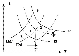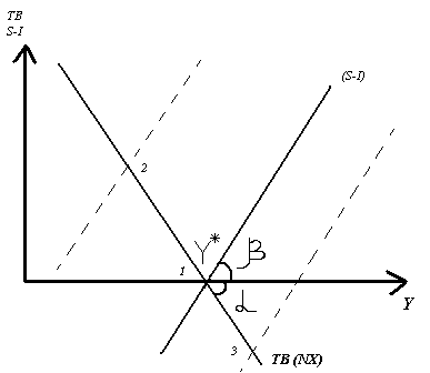 1. Ця ф-ція S-І позитивно пов’язана з У. Це пов’язано з тим, що за моделлю S= S(У), а інвестиції фіксовані. 2. Кут β відображає граничну схильність до заощаджень. Т.1 харак-є одночасну рівновагу і внутр. і зовн. за умови, що У* є потенційним У. 3. Якщо б ці ф-ції перетнулись по-інш. в т.2, то тоді б такої рівноваги не було б. В т.2 Уфакт > У*, а ТВ – від’ємний. Взаємодія 2ох політик і 2ох рівноваг за моделлю ТВ Ситуація 1. Суть: використ. стимулююча фін.пол-ка вирішується питання про те, як порушиться при цьому загальна рівновага і як її відновии так, щоб ТВ став знову 0.