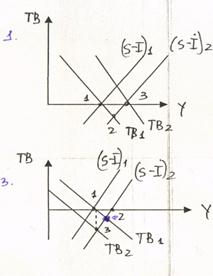 1. Під впливом стимул. фін. політики відбулось зрушення (S-I) і збільш. ВВП (У). Приріст ВВП (т.1 т.2). Це можна пояснити за допом. витратного мультиплікатора: ∆У = ∆G * 1/ s+m 2. Збільш. по у спричинило зрушення ТВ. 3. Так як зміна ТВ пов’язана зі зміною Im,то: