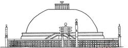 Культовая архитектура в период расцвета рабовладельческих государств Примерно с VI в. до н. э. центр экономической культурной жизни Индии надолго устанавливается в бассейне Ганга. В результате длительных междоусобных войн в нем образуется государство Магадха. В V в. до н. э. оно расширило свои границы за счет освобожденных от персов северо-западных районов, а в IV в. сумело отразить войска Александра Македонского. Переломным этапом в ее истории стал VI в. до н. э., когда в обстановке, накаленной междоусобными и внешними войнами, происходила коренная ломка в установившемся религиозном мировоззрении. Буддийский культ, не признающий классовых и сословных различий, быстро завоевал господствующее положение. Начали появляться монашеские общины, которые сначала не имели собственных культовых и жилых зданий и помещений. Они собирались для встреч и отправления церемоний в естественных пещерах или просто под временными навесами, в остальное время проповедовали и собирали пожертвования по городам и поселениям. Постепенно, с притоком людей и пожертвований, монастырские общины видоизменились в организации с строгим уставом, которые уже могли заниматься сооружением необходимых им построек. В этот период зародились основные типы монументальных культовых сооружений: - ступы, - скальные храмы и святилища, позднее и наземные храмы, - монастыри и монастырские комплексы (сангхарама или вихара). X-XI вв. - времена наивысшего расцвета индийской архитектуры, наступившего в период господства феодального строя. В то время Индия состояла из отдельных феодальных государств, где на основе богатого культурного наследия предыдущих эпох развились местные архитектурные и художественные школы. Индийская архитектура с древних времен выработала свой художественный язык, источником которой, как считает большинство исследователей, стали традиции народной архитектуры. Монументальная архитектура этого периода - это, главным образом, брахманские и джайнские (два направления индуизма) храмы и их комплексы. На последующее развитие индийской архитектуры большое воздействие оказал ислам, под влиянием которого ее характер претерпел изменения, обогатив ее новыми формами дворца и мавзолеями. Очень интересна с архитектурной точки зрения так называемая «ступа», выросшая из простого холмообразного надгробия. С того времени, как Будде стали поклоняться, как божеству, появилась нужда в хранилищах реликвий, таким образом возникли курганы для хранения священных буддийских реликвий - ступы. Вокруг ступы сооружали ограждение с четырьмя воротами-входами, ориентированными по сторонам света. Внутри ограждения вокруг ступы пролегала дорожка, по которой совершали молитвенный ритуальный обход ступы. Ворота обычно украшались рельефами, изображающими сцены из жизни Будды. Постепенно ступа превращается в монументальный памятник — свободно стоящее сооружение из камня и кирпича. Сначала это были простые постройки без украшений в форме, символизирующей перевернутую миску Будды, служившую для сбора подаяний. Они имели вид полусферы или сплющенного купола на цилиндрическом квадратном основании. Самые древние из обнаруженных ступа были выложены из кирпича. Сверху на ступа помещался небольшой павильон с металлической мачтой, на которой закреплялись зонты, символизирующ