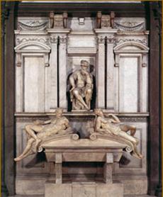 Во флорентийской церкви Сан-Лоренцо Микеланджело почти 15 лет проработал над так называемой Новой сакристии с саркофагами Лоренцо и Джулиано Медичи (сама сакристия была построена ранее Брунеллески) по заказу папы Климента VII, который был из рода Медичи. Микеланджело производит облицовку помещения в формах, близких к его предшественнику, с введением полихромии — белого и серого мрамора. В этом интерьере он помещает саркофаги герцогов и декорирует стену, служащую им фоном. В свободном кубическом пространстве (со стороной квадрата около 12 м), увенчанном сводом, Микеланджело разместил пристенные масштабные гробницы Медичи, не в традиционных нишах. Обоих герцогов Микеланджело изобразил аллегорически в доспехах римских военачальников, одного мужественного, энергичного, но безучастного, другого — погруженного в глубокое раздумье.
