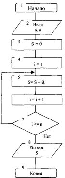 Словесний опис алгоритму представлений|уявляти| вищим. Схема алгоритму зображена|змальовувати| на Мал. 1. Пояснимо|тлумачитимемо| її. 1. Схема починається з символу «Пуск-останов». Кожен обчислювальний процес має початок, і це відображається на схемі. Усередині символу записується слово «Початок». 2. Спочатку дані вводяться в пам'ять комп'ютера. Для позначення цієї операції використовується символ «Ввод- вивід», усередині якого записуються слово «Введення». Назва вектора а і його вимірність n. 3. Сумі привласнюється початкове значення, яке дорівнює нулю (S: = O). Це означає пересилку 0 в область пам'яті, призначену для накопичення суми. Операція на схемі відображається символом «Процес». Прийняте позначення суми S розшифровується символом «Коментар». 4. Індекс i, що визначає порядковий номер елементу, має значення 1. При i = 1 відбувається звернення до першого елементу вектора.