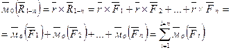 Доказательство. Пусть дана система сходящихся сил (всего n сил), приложенных в точке В некоторого тела. Расположение произвольной точки О относительно точки В характеризуется радиус-вектором . Равнодействующая этой системы сил есть векторная сумма: .