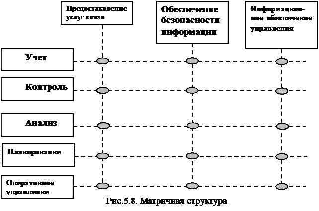 Современные проектные структуры, как правило, почти не формализованы, не имеют строгой иерархии подчиненности, отличаются хорошей адаптивностью к воздействиям извне. Матричная структура. Развитием проектных структур является получившая широкое распространение матричная структура. Она представляет собой (рис.5.8) комбинацию двух видов деления: по функциям (вертикаль) и по продукту (горизонталь). В матричной структуре имеется двойное подчинение: руководителю подразделения (функциональная линия) и руководителю проекта (продуктовая линия). Руководитель проекта определяет, что и когда должно быть сделано, а руководители подразделений - каким образом должна быть выполнена эта работа. Матричная структура имеет ряд очевидных преимуществ. Она дает возможность быстро адаптироваться к изменяющимся внутренним и внешним условиям; способствует координации функций, прямому доступу к информации. Недостатками матричной структуры являются сложность реализации функций управления и возможные конфликты целей.
