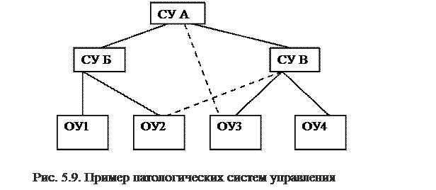 Исследования в практике управления показали, что использование проектных и матричных структур целесообразно при следующих условиях: · разрабатываемый проект уникален, работа над ним не носит рутинный характер; · происходит частая смена технологии; · работа группы над проектом должна вестись строго ограниченное время; · решение осуществляется за счет общих усилий и способностей членов группы. Имеется несколько разновидностей программно-целевой (проектной структуры). Наиболее известными являются бригадная и венчурная (инновационная) структуры. Бригадная форма организации обычно используется в производстве, когда вся бригада принимает участие в производстве продукта от начальной до конечной стадии. Названия венчурные и инновационные структуры в определенной степени являются синонимами. Английское venture означает «рискованное дело», «рискованное предприятие». Как правило, рискованное дело в бизнесе связано с разработками инноваций, т.е. принципиально новых технологий, товаров или услуг. Инновационные структуры в крупных организациях (корпорациях) имеют несколько разновидностей в зависимости от ряда факторов: значимости разрабатываемых проектов, их целевой направленности и сложности, а также от степени формализации и самостоятельности деятельности. Достоинствами систем с изменяющейся структурой являются хорошая адаптация к условиям внешней среды и высокая потенциальная эффективность в достижении поставленных целей. Однако эти возможности могут быть в полной мере реализованы только при учете двух факторов - планирования и управления деятельностью самой системы управления, а также психологических аспектов. При неправильном делении систем на подсистемы и нарушении нормальных связей между подсистемами, расположенными на различных иерархических уровнях, возникают структуры, называемые патологическими. Простейший пример патологии - двойное подчинение, когда для некоторого ОУ существуют две системы управления. Так, на рис. 5.9 показано, что ОУ 2 одновременно подчиняется системам управления Б и В. Чтобы такой ОУ мог функционировать нормально, необходимы очень четкое разделение функций между системами Б и В, а также координация их действий со стороны центрального органа А. В противном случае, при несогласованных действиях подразделений Б и В, находящийся в их подчинении ОУ 2 будет в некоторых случаях получать противоречащие друг другу указания и распоряжения, а в других ситуациях - не получать никаких указаний. Ясно, что и в том, и в другом случае эффективность организации в целом существенно снижается. Однако бывает, что двойное подчинение вводится специально. Так, например, в организациях с оперативным дежурным персоналом (ИТКС, воинские части, электростанции, нефтехимические заводы и т.п.) персонал одной смены, дежурящий в разных подразделениях, в административном отношении подчинен руководству соответствующего подразделения, а в оперативном - оперативному дежурному (начальнику смены).