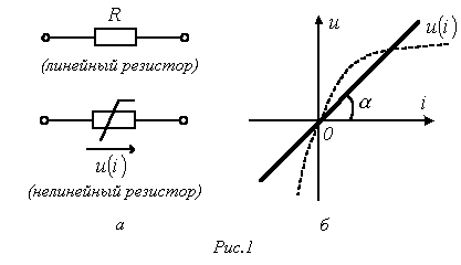Основной характеристикой резистивного элемента является зависимость (или ), называемая вольт-амперной характеристикой (ВАХ). Если зависимость представляет собой прямую линию, проходящую через начало координат (см.рис. 1,б), то резистор называется линейным и описывается соотношением