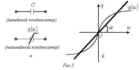 У нелинейных диэлектриков (сегнетоэлектриков) диэлектрическая проницаемость является функцией напряженности поля, что обусловливает нелинейность зависимости (рис. 3,б). В этом случае без учета явления электрического гистерезиса нелинейный конденсатор характеризуется статической и дифференциальной емкостями.
