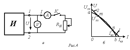 где - напряжение на зажимах источника при отключенной нагрузке (разомкнутом ключе К в схеме на рис. 4,а); - внутреннее сопротивление источника.