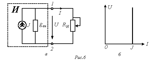 На этой схеме символом J обозначен элемент, называемый идеальным источником тока. Ток в ветви с этим элементом равен и не зависит от напряжения на зажимах источника, следовательно, ему соответствует ВАХ на рис. 6,б. На этом основании с учетом (2) у такого источника , т.е. его внутреннее сопротивление .