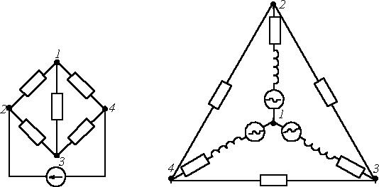 Представленные схемы различны и по форме, и по назначению, но каждая из указанных цепей содержит по 6 ветвей и 4 узла, одинаково соединенных. Таким образом, в смысле геометрии (топологии) соединений ветвей данные схемы идентичны.