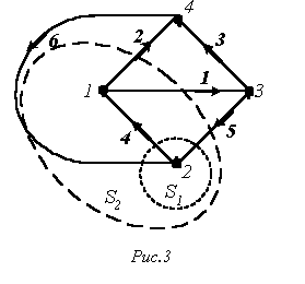 Сечение можно наглядно изобразить в виде следа некоторой замкнутой поверхности, рассекающей соответствующие ветви. Примерами таких поверхностей являются для нашего графа на рис. 3 S1 и S2. При этом получаем соответственно сечения, образованные ветвями 6-4-5 и 6-2-1-5.