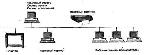 Рисунок 2 - Приклад мережі масштабу відділу Мережі кампусів отримали свою назву від англійського слова campus - студентське містечко. Саме на території університетських городків часто виникала необхідність об'єднання декількох дрібних мереж в одну велику мережу. Зараз цю назву пов'язують не тільки із студентськими городками, але використовують і для позначення мереж будь-яких підприємств і організацій. на рівні мережі кампусу виникають проблеми інтеграції неоднорідного апаратного і програмного забезпечення. Типи комп'ютерів, мережевих операційних систем, мережевого апаратного забезпечення можуть відрізнятися в кожному відділі. Звідси витікають складнощі управління мережами кампусів. Адміністратори повинні бути в цьому випадку більш кваліфікованими, а засоби оперативного управління мережею - досконалішими. Корпоративні мережі об'єднують велику кількість комп'ютерів на всіх територіях окремого підприємства. Для корпоративної мережі характерні: - масштабність - тисячі призначених для користувача комп'ютерів, сотні серверів, величезні об'єми що зберігаються і передаваних по лініях зв'язку даних, безліч різноманітних застосувань; - високий ступінь гетерогенності - типи комп'ютерів, комунікаційного устаткування, операційних систем і додатків різні; - використання глобальних зв'язків - мережі філій з'єднуються за допомогою телекомунікаційних засобів, зокрема телефонних каналів, радіоканалів, супутникового зв'язку. Призначення мережі Перше призначення мереж - сумісне використання інформації. При цьому слід звернути увагу на те, яка інформація має життєво важливе значення для вашої організації? Які дані вимагають обмеження доступу або постійного доступу для всіх співробітників? Сумісне використання апаратних засобів. Комп'ютери, не підключені до мережі, не дістають ефективного доступу до ресурсів, що розділяються. Наприклад, в невеликому офісі з 10 автономними комп'ютерами і одним принтером виводити інформацію на друк може тільки користувач, до ПК якого цей принтер приєднаний. Останнім доведеться записувати дані на дискету і передавати їх на комп'ютер з принтером. Така організація роботи заважатиме користувачеві ПК з принтером. Мережа дозволяє працювати з принтером всім підключеним до неї користувачам, а не тільки тому, до машини якого приєднаний пристрій друку. Мережні комп'ютери можуть спільно працювати з наступними пристроями: а) факс-модемами; б) сканерами; в) жорсткими дисками; г) накопичувачами на гнучких дисках; д) пристроями читання CD-ROM; е) накопичувачами на магнітній стрічці для резервного копіювання даних; ж) графічними пристроями; з) а також з практично будь-якими іншими пристроями, що підключаються до комп'ютерів Сумісне використання програмних ресурсів. Інсталяція і настройка конфігурації програмного забезпечення в мережі значно скорочують об'єм роботи, потрібної для забезпечення доступу до комп'ютерних програм у всій організації. Збереження інформації. Мережа дозволяє виконувати централізоване резервне копіювання інформації. Резервне копіювання - одна з найбільш важливих операцій, що входять в обов'язки адміністратора мережі. Комп'ютери - складні пристрої, і рано чи пізно користувачі стикаються з відмовами, які завжди трапляються в самий невідповідний момент. Мережеві компоненти також можуть вихо