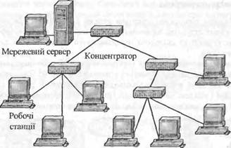 Прикладом недорогої мережі з шинною топологією є Ethernet 10Base-2 (таку мережу називають також "тонкою" Ethernet). Якщо в мережі з шинною топологією виникають проблеми, переконайтесь, що до кабелю підключено крайове навантаження. У мережах без крайового навантаження з'являються часті помилки, в результаті мережі стають некерованими. Переваги шинної топології: - вона надійно працює в невеликих мережах, проста у використанні і зрозуміла; - шина вимагає менше кабелю для з'єднання комп'ютерів і тому дешевше, ніж інші схеми кабельних з'єднань; - шинну топологію легко розширити. Два кабельні сегменти можна зістикувати в один довгий кабель за допомогою циліндрового з'єднувача BNC. Це дозволяє підключити до мережі додаткові комп'ютери; - для розширення мережі з шинною топологією можна використовувати повторювач. Повторювач (repeater) підсилює сигнал і дозволяє передавати його на великі відстані. Недоліки шинної топології: - інтенсивний мережний трафік значно знижує продуктивність такої мережі. Оскільки будь-який комп'ютер може передати дані в довільний момент часу, і в більшості мереж вони не координують один з одним моменти передачі. у мережі з шинною топологією з великим числом комп'ютерів станції часто переривають один одного, і чимала частина смуги пропускання (потужність пересилання інформації) втрачається даремно. При додаванні комп'ютерів до мережі проблема ще більш посилюється; - кожен циліндровий з'єднувач ослабляє електричний сигнал, і велике їх число перешкоджатиме коректній передачі інформації по шині; - мережі з шинною топологією важко діагностувати. Розрив кабелю або неправильне функціонування одного з комп'ютерів може привести до того, що інші вузли не зможуть взаємодіяти один з одним. В результаті вся мережа стає непрацездатною. Зіркоподібна топологія. Зіркоподібна мережа (рис. 1, г) характеризується наявністю центрального вузла комутації — мережного сервера, до якого (або через який) надсилаються всі повідомлення. На мережний сервер, крім основних функцій, можуть бути покладені додаткові функції з узгодження швидкостей роботи станцій і перетворення протоколів обміну, це дозволяє в рамках однієї мережі об'єднувати різнотипні робочі станції. Рисунок 2 іллюструє зіроподібну топологію де всі кабелі йдуть до комп'ютерів від центрального вузла - концентратора (hub).
