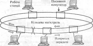 Рисунок 4 - Гібридна зіркоподібна мережа Мережі з кільцевою топологією. У кільцевій мережі кожен комп'ютер пов'язаний з наступним, а останній - з першим, як наведено в рисунку 1, е. Кільцева топологія застосовується в мережах, що вимагають резервування певної частини смуги пропускання для критичних за часом засобів (наприклад, для передачі відео і аудіо), у високопродуктивних мережах, а також при великому числі клієнтів, що звертаються до мережі (що вимагає її високої пропускної спроможності). Принцип роботи мереж з кільцевою топологією. У мережі з кільцевою топологією кожен комп'ютер з'єднується з наступним комп'ютером, що ретранслює ту інформацію, яку він отримує від першої машини. Завдяки такій ретрансляції мережа є активною, і в ній не виникають проблеми втрати сигналу, як в мережах з шинною топологією. Крім того, оскільки "кінця" в кільцевій мережі немає, ніяких крайових навантажень не потрібно. Деякі мережі з кільцевою топологією використовують метод естафетної передачі. Спеціальне коротке повідомлення-маркер циркулює по кільцю, поки комп'ютер не побажає передати інформацію іншому вузлу. Він модифікує маркер, додає електронну адресу і дані, а потім відправляє його по кільцю. Кожен з комп'ютерів послідовно отримує даний маркер з доданою інформацією і передає його сусідній машині, поки електронна адреса не співпаде з адресою комп'ютера-одержувача, або маркер не повернеться до відправника. Комп'ютер, що отримав повідомлення, повертає відправникові відповідь, підтверджуючу, що послання прийняте. Тоді відправник створює ще один маркер і відправляє його в мережу, що дозволяє іншій станції перехопити маркер і почати передачу. Маркер циркулює по кільцю, поки яка-небудь із станцій не буде готова до передачі і не захопить його. Всі ці події відбуваються дуже часто: маркер може пройти кільце з діаметром в 200 м приблизно 10000 разів в секунду. У деяких ще швидших мережах циркулює відразу декілька маркерів. У інших мережних середовищах застосовуються два кільця з циркуляцією маркерів в протилежних напрямах. Така структура сприяє відновленню мережі у разі виникнення відмов. Прикладом швидкої волоконно-оптичної мережі з кільцевою топологією є FDDI. Переваги мережі з кільцевою топологією: - оскільки всім комп'ютерам надається рівний доступ до маркера жоден з них не може монополізувати мережу; Недоліки мережі з кільцевою топологією: - відмова одного комп'ютера в мережі може вплинути на працездатність всієї мережі; - додавання або видалення комп'ютера змушує розривати мережу, усувається завдяки використанню "подвійного" кільця. Для цього до складу локальної мережі включають додаткові лінії зв'язку пристрої реконфігурації — спеціальні перемикальні пристрої, прості й надійні. На рис. 5. показано схему перемикання з одного кільця на інше у випадку виходу з ладу одного із сегментів кільця.