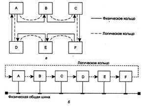 У рамках кільцевої фізичної структури, як правило, реалізується логічна кільцева структура (рис. 12 а). В цьому випадку логічна і фізична структури збігаються, тобто маркер і дані передаються кільцем в одному напрямку.