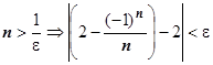 (a -e, a +e), т.е. вне этого интервала лежит не более чем конечное число точек последовательности. Докажем, например, что последовательность при сходится к двум. Возьмём "e>0. Требуется доказать, что существует такое N = N (e), что при n > N выполняется неравенство | an - a |<e, т.е. . Таким образом, если в качестве N = N (e) мы возьмём N (e)= (где Е(х)-определённая выше функция - целая часть числа х), то при n > N выполняется неравенство , что и требовалось. Расположение нескольких первых членов последовательности на числовой оси приведено на рисунке снизу. Сходимость последовательности к числу 2 выражается в том, что члены последовательности сгущаются около точки х =2.