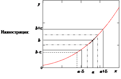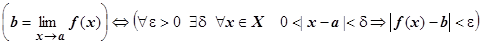 Опр.4.4.1. Пусть а - предельная точка области определения Х функции f (x). Число b называется пределом функции при х, стремящемся к а, если для любого числа e>0 существует такое число d (вообще говоря, положительное и зависящее от e), что если х Î Х принадлежит также проколотой d-окрестности Обозначения: