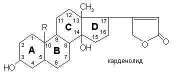 В зависимости от строения ненасыщенного лактонного кольца все кардиотонические гликозиды делятся на две группы: 1) карденолиды - с пятичленным лактонным кольцом (гликозиды наперстянки, строфанта, ландыша, горицвета);