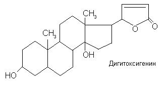 В настоящее время выделено около 400 индивидуальных гликозидов, из них большая часть (380) – карденолиды. В зависимости от заместителя в положении C10 карденолиды подразделяются на подгруппы. 1. Подгруппа наперстянки включает гликозиды, агликоны которых в положении С10 имеют метильную группу -СН3. Гликозиды этой подгруппы медленно всасываются и медленно выводятся из организма, обладают кумулятивным действием, например гликозид дигитоксин (агликон – дигитоксигенин).