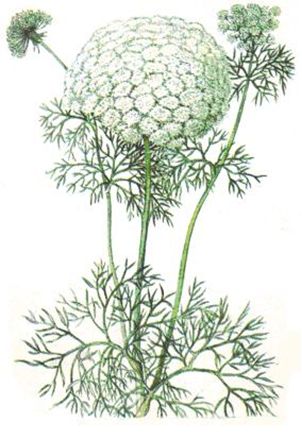 Рис. 7.21. Виснага морковевидная (амми зубная) – Visnaga daucoides Gaertn. Распространение. Родина – страны Средиземноморья. Произрастает в диком виде в Малой Азии, Северной Африке, Южной Европе. Как одичавшее встречается на Кавказе, преимущественно в Азербайджане. Культивируется в Краснодарском крае, Молдавии и южных районах Украины. Местообитание. Растет в степях, по склонам гор и как сорняк в посевах. Заготовка. Сырьем являются плоды и смесь плодов с половой. Созревание плодов амми происходит неодновременно, поэтому урожай убирают двумя способами – раздельным и прямым комбайнированием. При раздельной уборке сырье состоит из 65-70 % зрелых и 30-35 % зеленых плодов. Уборка прямым комбайнированием применяется поздней осенью в период массового созревания и побурения плодов. Сушка. На воздухе или в сушилках при температуре не более 60 ºС. Стандартизация. ФС 42-2098-83 (плоды); ФС 42-530-72 (смесь плодов с половой). Внешние признаки. Смесь зрелых и недозрелых плодов. Плоды - вислоплодники продолговато-яйцевидной формы, длиной до 2 мм, толщиной около 1 мм, в сырье большей частью распадающиеся на два полуплодика (мерикарпия) с 5 слабо выступающими ребрами (рис. 7.22). Цвет серовато-бурый, ребра более светлые, недозрелые плоды зеленоватые. Запах слабый, характерный. Вкус горьковато-пряный, слегка жгучий. Полова состоит из частей цветков, плодоножек, лучей зонтика и зонтичков, измельченных листьев и стеблей.