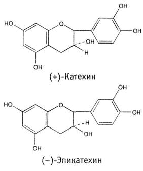 Молекула флаван-3-олов содержит два асимметрических атома углерода в пирановом кольце (С2 и С3) и, следовательно, для каждой молекулы возможны четыре изомера и два рацемата. Например, известные изомерные соединения (+)-катехин и (–)-эпикатехин отличаются конфигурацией гидроксильной группы третьего углеродного атома, они отличаются также по физическим свойствам (температура плавления, удельное вращение и др.). Эпикатехин обладает большей биологической активностью. Накапливаются в листьях чая китайского. 2. Лейкоантоцианидины (флаван-3,4-диолы).