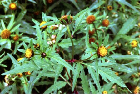 Рис. 8.22. Череда трехраздельная - Bidens tripartita L. Распространение. Голарктический вид. На территории России повсеместно, кроме Крайнего Севера. Местообитание. Растение влаголюбивое. Растет в сырых местах, по болотам, берегам рек и ручьев, на огородах как сорняк. Часто образует сплошные заросли. Культивируется в Краснодарском крае и на Украине (Львовская область). Заготовка. Облиственные стебли длиной до 15-20 см срезают или ощипывают в фазе вегетации до образования бутонов. В более поздние сроки собирают только боковые побеги. Сырье очищают от грубых толстых стеблей. На плантациях применяют механизированный сбор травы череды. Примеси. Возможная примесь - другие, совместно произрастающие виды череды (таблица; рис. 8.23). Изучены и подтверждаются лечебные свойства ч. лучистой и ч. поникшей, но пока эти виды не подлежат заготовке.
