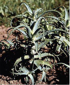 Рис. 9.3. Алоэ древовидное - Aloë arborescens Mill. Распространение. Естественно произрастает в Южной Африке. Возделывается в специализированных хозяйствах Закавказья, в условиях полувлажных субтропиков Грузии. В зимнее время алоэ сохраняют в теплицах, а весной высаживают в грунт. Из многочисленных видов алоэ возможна культура только алоэ древовидного, наиболее морозоустойчивого. Заготовка. В течение лета периодически срезают наиболее развитые нижние и средние листья. Их отделяют от стебля вместе с сухими влагалищами, охватывающими стебель. Не допускается отламывание и срезка листьев во избежание потери сока. Заготовке также подлежат побеги алоэ с толщиной стебля до 12 мм, их срезают длиной 3-15 см. Сырье после заготовки не должно храниться более 3-4 часов. Для получения сырья «Листья алоэ древовидного сухие» собранные листья консервируют по методу В.П. Филатова, выдерживая их в темноте при температуре 4-8 ºС в течение 12 суток, а затем сушат в вакуум-сушильных шкафах при температуре 75-80 ºС до остаточной влажности не более 10 %. В настоящее время предложено сушить сырье без использования вакуум-сушильных шкафов. Охранные мероприятия. Не разрешается срезать плохо развитые листья с небольшой массой. Стандартизация. Листья алоэ древовидного свежие - ФС 42-2191-84. Побеги боковые алоэ древовидного свежие - ФС 42-987-87. Листья алоэ древовидного сухие - ВФС 42-2800-91. Внешние признаки. Свежие сочные листья мечевидной формы длиной 15-45 см, шириной у основания 2-5,5 см, толщиной 0,7-1,5 см; с верхней стороны вогнутые, с нижней - выпуклые, голые, толстые, мясистые, покрытые восковым налетом, с шиповато-зубчатым краем. Листья имеют слабый своеобразный запах и очень горький вкус. Листья сухие - цельные или изломанные куски высушенных листьев длиной до 45 см, шириной у основания до 5,5 см, толщиной до 2,5 см, хрупкие, морщинистые, мечевидной формы со стеблеобъемлющими пленчатыми влагалищами. По краю шиповато-зубчатые. Излом ячеистый. Цвет от зеленовато-бурого до буровато-коричневого. Запах слабый, своеобразный. Вкус горьковатый. Боковые побеги длиной от 3 до 15 см с 3-12 листьями. Листья сочные, со стеблеобъемлющими пленчатыми влагалищами, сверху вогнутые, снизу выпуклые, край шиповатый. Длина листьев от 5 до 25 см, ширина от 1 до 2,5 см. Стебель толщиной от 6 до 12 мм. Микроскопия. При рассмотрении листа с поверхности видны клетки верхнего эпидермиса с малоизвилистыми или почти прямыми стенками, нижнего - извилистые. Устьица с 4 околоустьичными клетками, погруженные. На поперечном срезе листа алоэ видны: толстостенный эпидермис, палисадная ткань, крупные клетки мезофилла со слизистым содержимым и рафидами, закрытые коллатеральные проводящие пучки, обращенные ксилемой внутрь, флоэмой кнаружи; вокруг флоэмы располагается слой «алоиновых» клеток, содержащих желтый сок. Качественные реакции. Для обнаружения антраценпроизводных в свежих листьях используют следующие реакции: при разбавлении нескольких капель сока равным количеством воды раствор мутнеет. После добавления к этому раствору нескольких капель 5 % раствора натрия гидроксида наблюдаются посветление и появление зеленовато-желтой окраски (производные антрона); при выдерживании среза листа в парах брома в течение 1 минуты поверхность его покрывается желтым налетом (производные антрахинона). Химический состав. Листья алоэ содержа