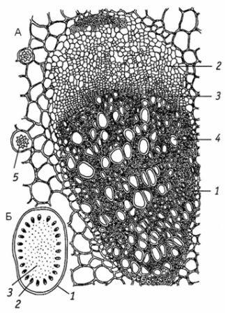 Рис. 9.17. Корневище змеевика большого: А – проводящий пучок на поперечном срезе: 1 – волокна; 2 – флоэма; 3 – камбий; 4 – ксилема; 5 – друза; Б – схема поперечного среза: 1 – пробка; 2 – проводящий пучок; 3 – сердцевина. Качественная реакция. Подлинность сырья подтверждается также качественной реакцией отвара из корневищ с раствором квасцов железоаммонийных. Черно-синее окрашивание свидетельствует о присутствии гидролизуемых дубильных веществ. Химический состав. Корневища змеевика содержат дубильные вещества гидролизуемой группы, количество которых колеблется от 8,3 до 36 %, фенольные кислоты и их производные (кислоту галловую, 6-галлоилглюкозу, 3,6-дигаллоилглюкозу), катехины (D-катехин, катехин, эпикатехин), кислоты эллаговую, пара -кумаровую, хлорогеновую. Корневища богаты крахмалом (до 26,5 %). Хранение. На складах - в мешках, в аптеках - в ящиках, в сухом, хорошо проветриваемом помещении. Срок годности 6 лет.