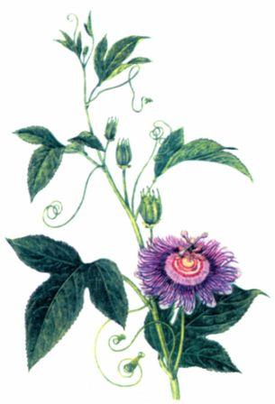 Пассифлора (страстоцвет) воплощенная - Passiflora incarnata L. ТРАВА ПАССИФЛОРЫ - HERBA PASSIFLORAE Другие названия: пассифлора инкарнатная, страстоцвет инкарнатный, кавалерская звезда Ботаническая характеристика. Многолетняя травянистая тропическая лиана, достигающая во влажных субтропиках Грузии 6-9 м длины. Стебель лазящий, голый, округлый. Листья очередные, длинночерешковые, кожистые, сверху зеленые, снизу сероватые, трехраздельные, до 20 см длиной и шириной. Доли эллиптические с заостренной верхушкой и мелкопильчатым краем. В пазухах листьев развиваются усики. Цветки на длинных цветоножках расположены одиночно в пазухах листьев, крупные (7-9 см в диаметре), правильные, пятичленные, с двойным околоцветником. Чашелистики ланцетные, кожистые, несущие на верхушке шиповатые выросты. Венчик состоит из почти свободных лепестков и «короны» (два кольца нитевидных бахромок) ярко-фиолетового цвета. Плод – съедобная сочная ягода желто-оранжевого цвета с черными семенами (рис. 10.34).