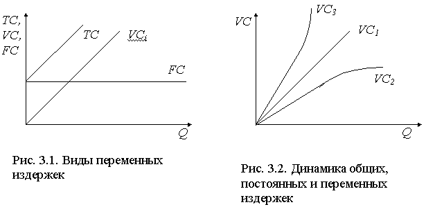 Постоянные издержки (FC) - это такие издержки, сумма которых в данный период времени не зависит от объемов производства и реализации. К ним относят: оклады административно-управленческого персонала, амортизацию основных фондов, аренду помещений, страховые взносы и другие. Постоянные издержки могут быть разделены на две группы: стартовые и остаточные. К стартовым издержкам относится та часть постоянных издержек, которые возникают с возобновлением производства и реализации. К остаточным - та часть постоянных издержек, которые продолжает нести предприятие, несмотря на то, что производство и реализация на какое-то время полностью остановлены. Графическим изображением постоянных издержек (FC) будет прямая, параллельная оси абсцисс (рис. 3.1). Переменные издержки (VC) - это те издержки, общая величина которых на данный период времени находится в непосредственной зависимости от объема производства и реализации продукции (затраты на сырье, топливо, электроэнергию, транспортные услуги, рабочую силу). Динамика переменных издержек зависит от их вида. Различают пропорциональные, дегрессивные и прогрессивные переменные издержки (рис. 3.2). Под пропорциональными издержками (VC1), понимают переменные издержки, которые изменяются в той же пропорции, что и производство и реализация. Дегрессивные переменные издержки (VC2) - это такие переменные издержки, которые изменяются в относительно меньшей пропорции, чем производство и реализация. Прогрессивные издержки (VC3) - это такие переменные издержки, которые изменяются в относительно большей пропорции, чем производство и реализация. Общие издержки (ТС) включают в себя сумму постоянных и переменных издержек (рис. 3.1). При разделении издержек на постоянные и переменные необходимо принимать во внимание тот факт, что издержки одного и того же вида могут вести себя по-разному. Ответ на вопрос, считать ли данные издержки постоянными или переменными, зависит прежде всего от двух факторов: длительности периода, рассматриваемого для принятия решения, и делимости производственных факторов.
