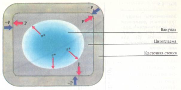 Рис. 1. Схема растительной клетки как осмотической системы: π* - осмотическое давление, Р - тургорное давление, -Р - противодавление клеточной стенки.