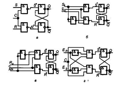 Фактически синхронные (тактовые) триггеры можно рассматривать как особый тип асинхронных триггеров, в которых существуют определенные ограничения на возможность действия информационных сигналов, что позволяет существенным образом упростить их синтез и анализ. В синхронных триггерах допускается изменять информационные сигналы только на протяжении периодов, когда тактовые импульсы блокируют входные цепи и предотвращают изменение состояния триггера (предполагается, что синхронный триггер должен изменять свое состояние под влиянием тактового импульса). Структура тактируемого уровнем "1" RS -триггера, приведена на рисунке 22, а. Синхронный RS -триггер, равно как и асинхронный RS -триггер, имеет запрещенную комбинацию RS = 11. Его схема широко используется при построении регистров.