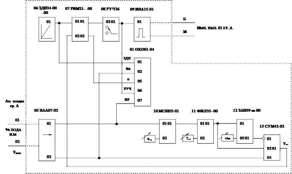 Структура конфигурации, реализующей прогнозирующий регулятор Смита, рассмотренный в предыдущей лекции, приведена на рисунке 9.1. Регулятор реализован на основе импульсной локальной АСР, дополненной моделью объекта регулирования на алгоблоках 10 – 12. На вход модели подаётся сигнал, пропорциональный положению вала ИМ, поскольку последний завершает формирование закона регулирования при использовании импульсного регулятора. Сигнал обратной связи с компенсацией чистого запаздывания формируется алгоблоком 13.