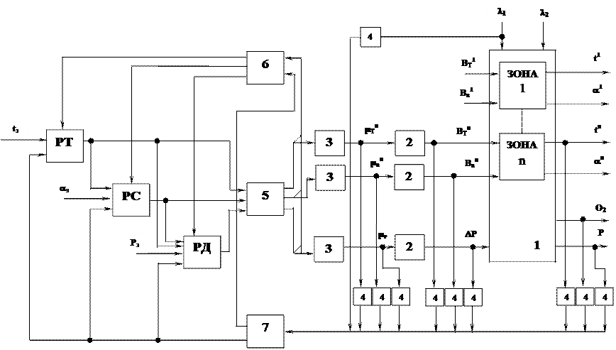Структурная схема системы непосредственного цифрового управления тепловым режимом методической печи, разработанная Научно – производственным объединением,,Киевский институт автоматики” (НПО КИА) приведена на рисунке 12.1 [8]. Поскольку структуры управления всех отапливаемых зон печи идентичны, представлены элементы, относящиеся к одной зоне или печи вцелом. Стабилизируются температуры греющей среды tn, соотношения an между расходами топлива Втn и воздуха Ввn по зонам (n=1, 2,…, N, обычно N<9), а также давление в рабочем пространстве Р и содержание кислорода О2 в продуктах сгорания. Возмущающие воздействия могут быть разделены на контролируемые l1 (темп продвижения металла и его характеристики) и неконтролируемые l2. В системе контролируются положения валов ИМ 3 на трубопроводах топлива (mтn) и воздуха (mвn), а также шибера печи (mр), а о положении РО 2 можно судить по соответствующим расходам. Заданные значения стабилизируемых параметров рассчитываются в составе задач оптимального управления, решаемых в управляющем вычислительном комплексе, и для рассматриваемой структуры являются внешними сигналами.