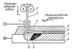 Для автоматической дуговой сварки под флюсом используют непокрытую электродную проволоку и флюс для защиты дуги и сварочной ванны от воздуха. Подача и перемещение электродной проволоки механизированы. Автоматизированы процессы зажигания дуги и заварки кратера в конце шва. В процессе автоматической сварки под флюсом (рис.6) дуга 10 горит между проволокой 3 и основным металлом 8. Столб дуги и металлическая ванна жидкого металла 9 со всех сторон плотно закрыты слоем флюса 5 толщиной 30—50 мм. Часть флюса расплавляется, в результате чего вокруг дуги образуется газовая полость, а на поверхности расплавленного металла — ванна жидкого шлака 4.